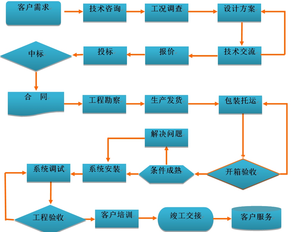 我公司經(jīng)過多年的經(jīng)驗(yàn)總結(jié),形成了一套完整合理的客戶服務(wù)流程體系,服務(wù)流程包括銷售服務(wù)、系統(tǒng)設(shè)計(jì)、采購、生產(chǎn)、檢驗(yàn)、工程實(shí)施、投運(yùn)、維護(hù)等各個(gè)環(huán)節(jié)。公司對相關(guān)的服務(wù)流程持續(xù)的完善和優(yōu)化,使系統(tǒng)服務(wù)的質(zhì)量管理更加標(biāo)準(zhǔn)化、程序化、規(guī)范化,為系統(tǒng)服務(wù)工作奠定了扎實(shí)的基礎(chǔ)。