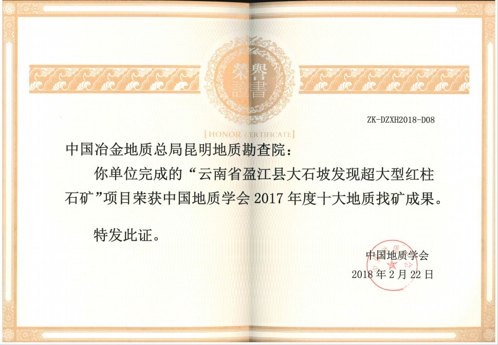 2018年2月22日,昆明地質勘查院完成的“云南省盈江縣大石坡超大型紅柱石礦”項目獲得中國地質學會2017年度“十大地質科技進展、十大地質找礦成果”獎。